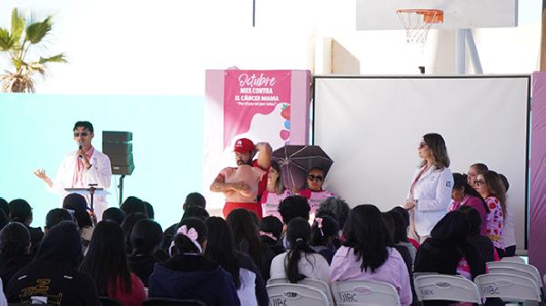Durante el panel, especialistas y personal de salud capacitado abordaron temas como qué es el cáncer de mama, sus principales causas y la técnica correcta de autoexploración, con el acompañamiento de la Asociación Mujeres de San Quintín y personal médico del IMSS.