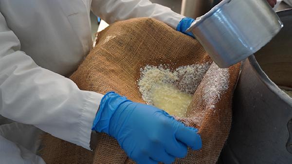 -Una vez firme, la cuajada se cortó para liberar el suero.