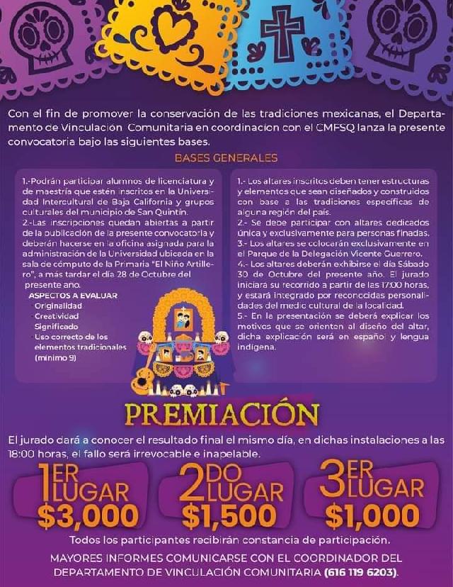 La universidad Intercultural de Baja California en coordinación con el Concejo Municipal Fundacional de San Quintín (CMFSQ), invita a la comunidad a participar en el concurso de “Altares de Muertos 2021 – La tradición que nunca muere” para este 30 de octubre de 2021.
